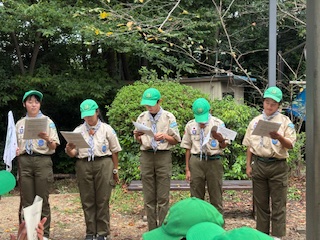 | 開会式 隊長の話 みんなしっかりと話を聞きます 開会式の後隊長から総合優秀班の 採点方法などの説明をうけます |