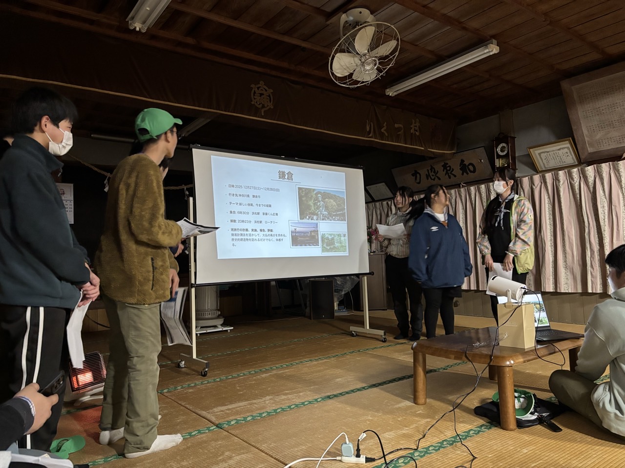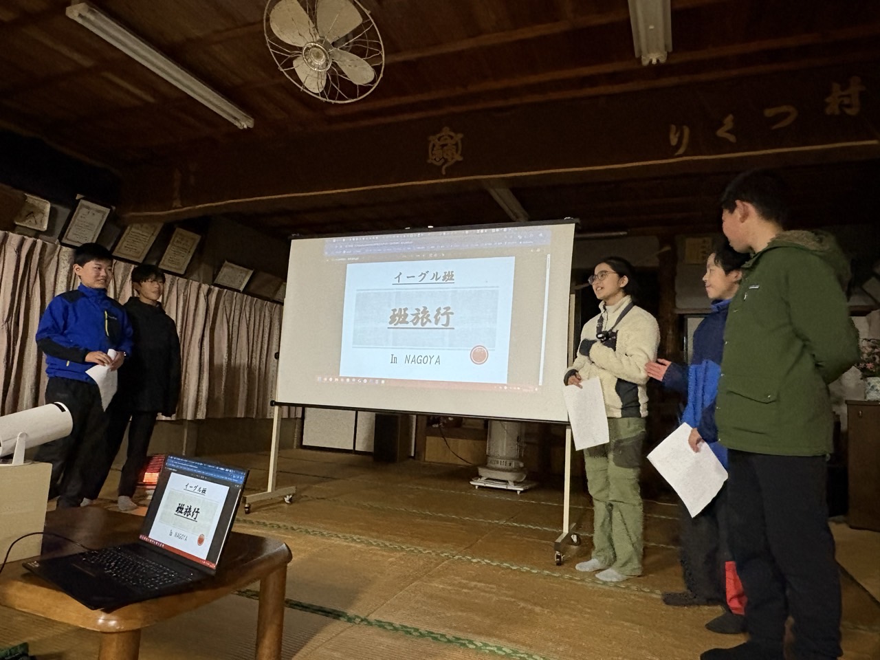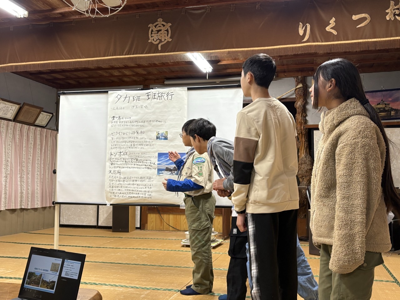 | 夜のセッション 12月の夜のセッションは例年12月に実施している 班旅行のプレゼンです プレゼンには保護者も参加してもらい、 内容を聞いて頂き質疑応答を行います イーグル班 フクロウ班 タカ班 ウグイス班 無事にプレゼンを終え、班長会議を行い1日目は終わりです |