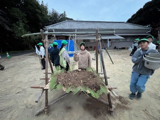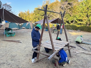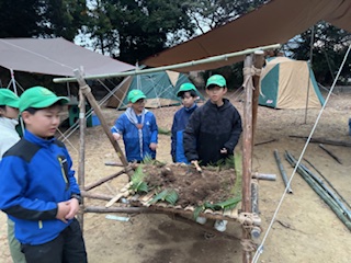 | 午後のセッション 野営工作(たちかまど、各班創作) 各班まずは、たちかまどから制作をしていきます ![]() かまどの上に土をのせて完成です 各班創作工作までは、間にあわず時間切れです |