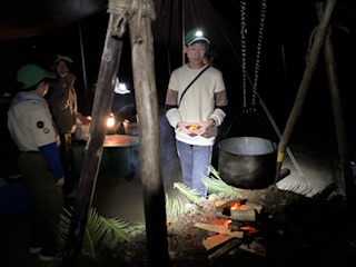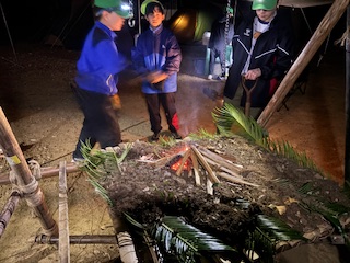 | 炊事 炊事の途中、国旗降納を行います すでに周囲は暗くなってきています ![]() たちかまどを使用して調理を行います ![]() メニューはミネストローネとパンです 本部は上班のウグイス班に調理してもらいました 写真は左からイーグル班、フクロウ班、タカ班 ![]() ![]() |