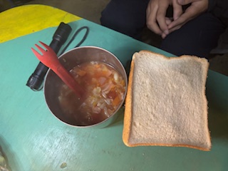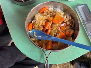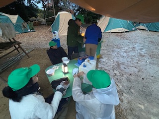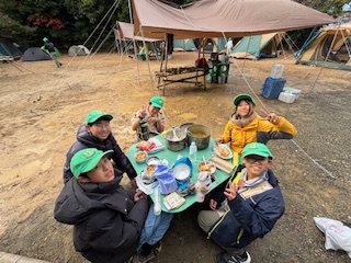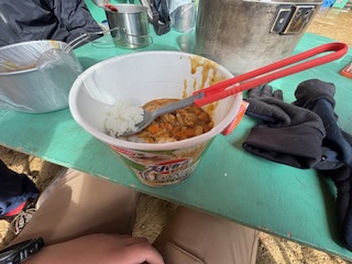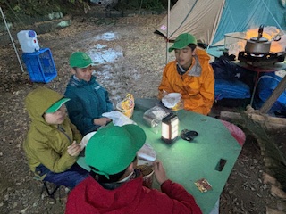 | 2日目 起床・朝食 深夜に結構な雨が降った為、地面はびちゃびちゃです メニューは湯でた野菜入りカップラーメン 写真は左からイーグル班、フクロウ班、タカ班 ![]() |