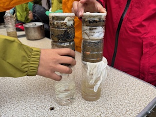 | 午前のセッション ろ過装置つくり 各班で作成したろ過装置の出来具合を評価してみます ![]() ![]() きれいに水の汚れがとれた班もありました |