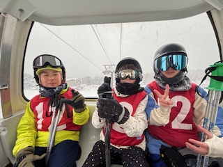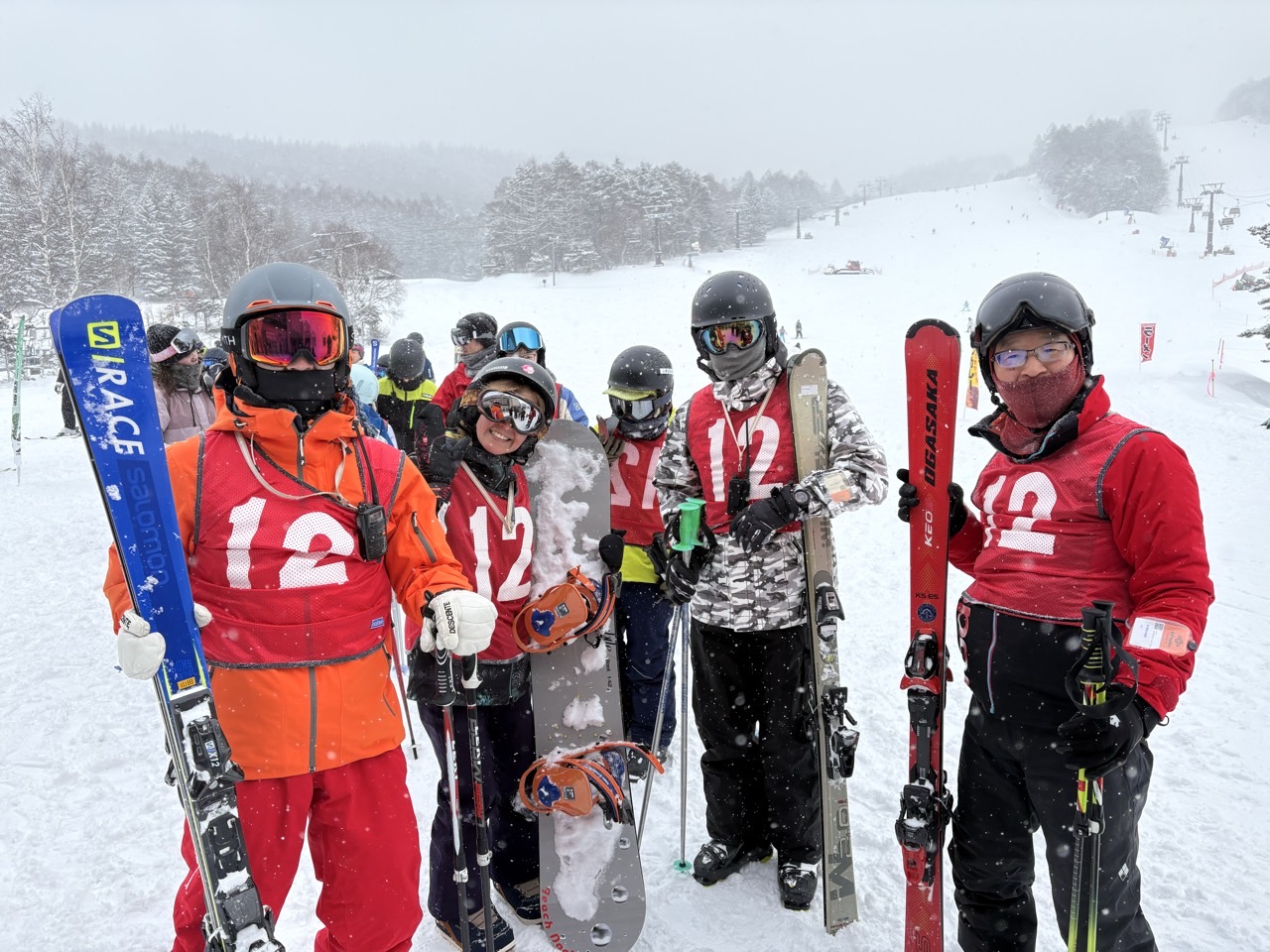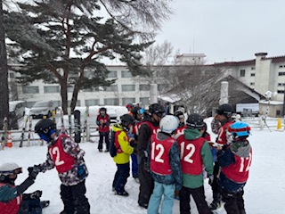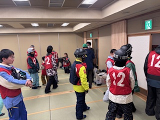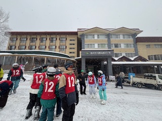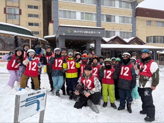 | 到着・着替え 男性と女性それぞれ部屋を分かれてスキーウェアに着替えました。 ![]() スキーブーツを履いて外へ! ![]() まずは記念撮影です。 |