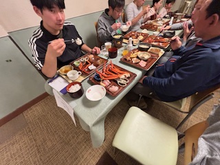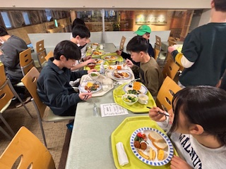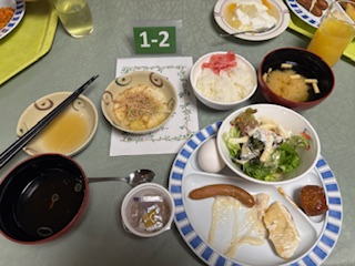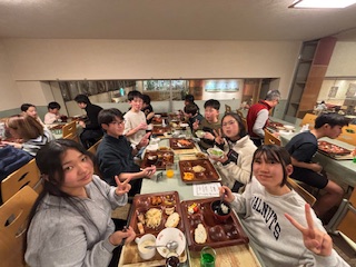 | 夕食 夕方のイベントの後は,体のケア,入浴などを行い, 夕食の時間を待ちました。 ![]() 夕食は楽しみにしていたバイキング 美味しくいただきました。 ![]() |