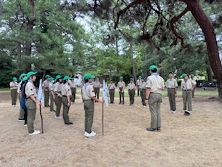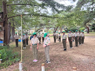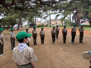 | 開会式 隊長の話 みんなしっかりと話を聞きます 開会式の後隊長から総合優秀班の 採点方法などの説明をうけます |