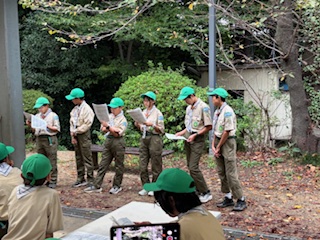 | 各班の決まりごとの報告 上進式の後に各班で班呼や班目標、モットーなどをきめました。 その報告を行います。 ![]() ![]() ![]() 班ゲームの実践も行います。だるまさんがころんだ 初めての隊集会なので記念撮影もとります。 使わせてもらった会場に弥栄 ![]() 無事に初の隊集会がおわり自転車で帰ります ベースにもどって総合優秀半優秀班の発表です ![]() 総合優秀班は『うぐいす班(上班)』でした 終わりは班長会議を実施 ![]() |